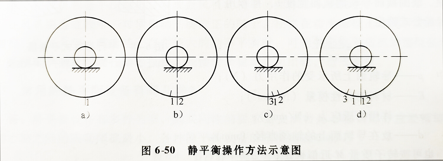 怎樣校正風(fēng)機(jī)轉(zhuǎn)子的靜平衡?導(dǎo)軌式靜平衡機(jī)是一種靈敏度較高、結(jié)構(gòu)簡(jiǎn)單、操作方便、使用普遍的設(shè)備,以它為例,來說明校正鳳機(jī)轉(zhuǎn)子的靜平衡操作方法。將轉(zhuǎn)子輕放在平衡機(jī)的軌道上(或圓盤夾角內(nèi)),使轉(zhuǎn)子水平軸線垂直于軌道軸線。用手扳動(dòng)轉(zhuǎn)子,使其任意停止。在轉(zhuǎn)子下面作一標(biāo)記“1”,如圖6-50a。為了消除摩擦阻力矩誤差,將轉(zhuǎn)子旋轉(zhuǎn)90°使標(biāo)記“1”與轉(zhuǎn)子中心線成水平位置,然后放開,待停止擺動(dòng)后,在此刻轉(zhuǎn)子的最下面作標(biāo)記“2”,如圖6-50b。再將轉(zhuǎn)子向相反方向轉(zhuǎn)90°,同樣使標(biāo)記“1”與轉(zhuǎn)子中心線成水平位置,放開,待擺動(dòng)停止后,在此刻轉(zhuǎn)子的最下面作標(biāo)記“3”, 如圖6-50c。如果標(biāo)記“1”、 “2”、“3”點(diǎn)相重合,則偏重位置就在重合點(diǎn)處,否則,偏重位置就在標(biāo)記“2”與“3”的中間,如圖6 -50d。