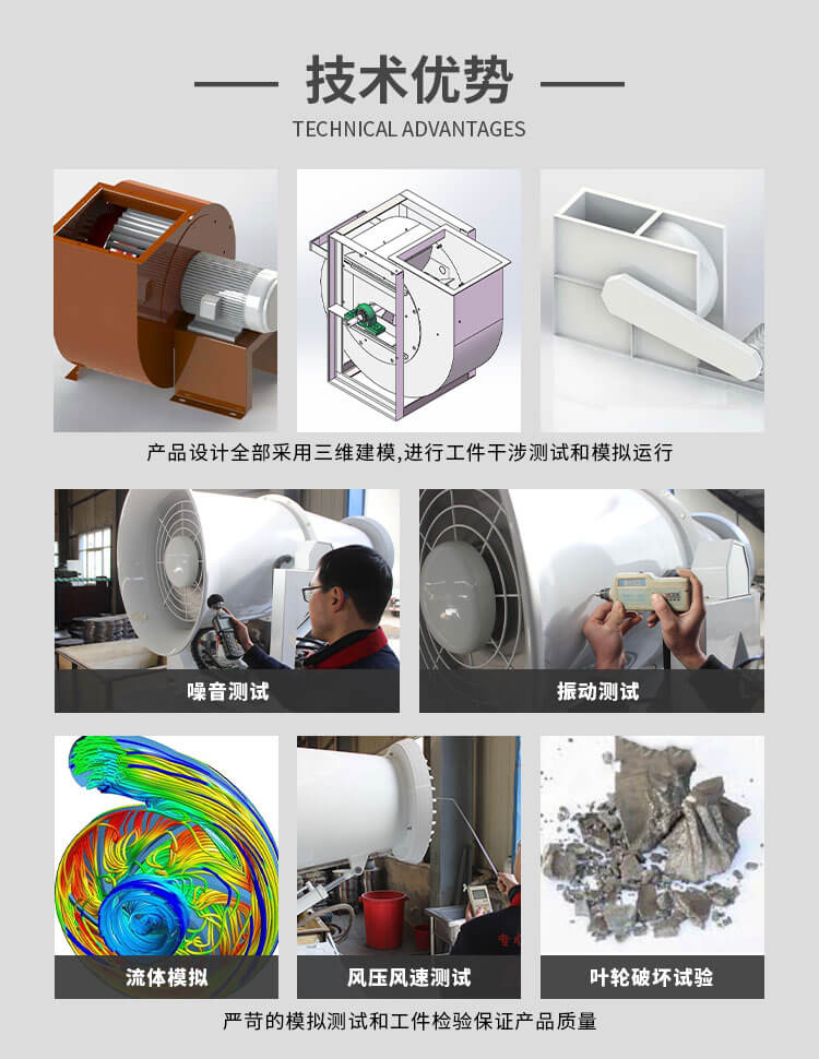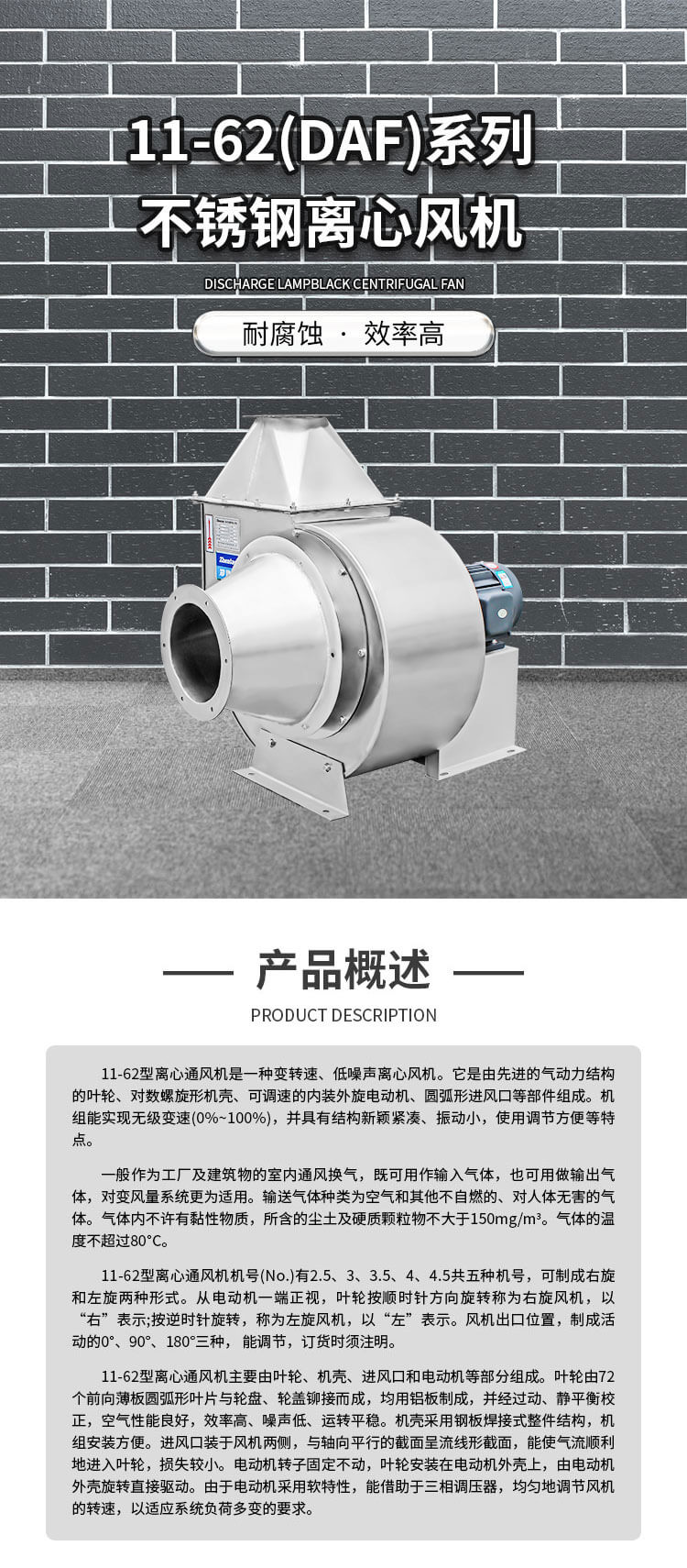 11-62型離心通風機是一種變轉速、低噪聲離心風機。它是由先進的氣動力結構的葉輪、對數螺旋形機殼、可調速的內裝外旋電動機、圓弧形進風口等部件組成。機組能實現無級變速(0%~ 100%),并具有結構新穎緊湊、振動小,使用調節方便等特點。