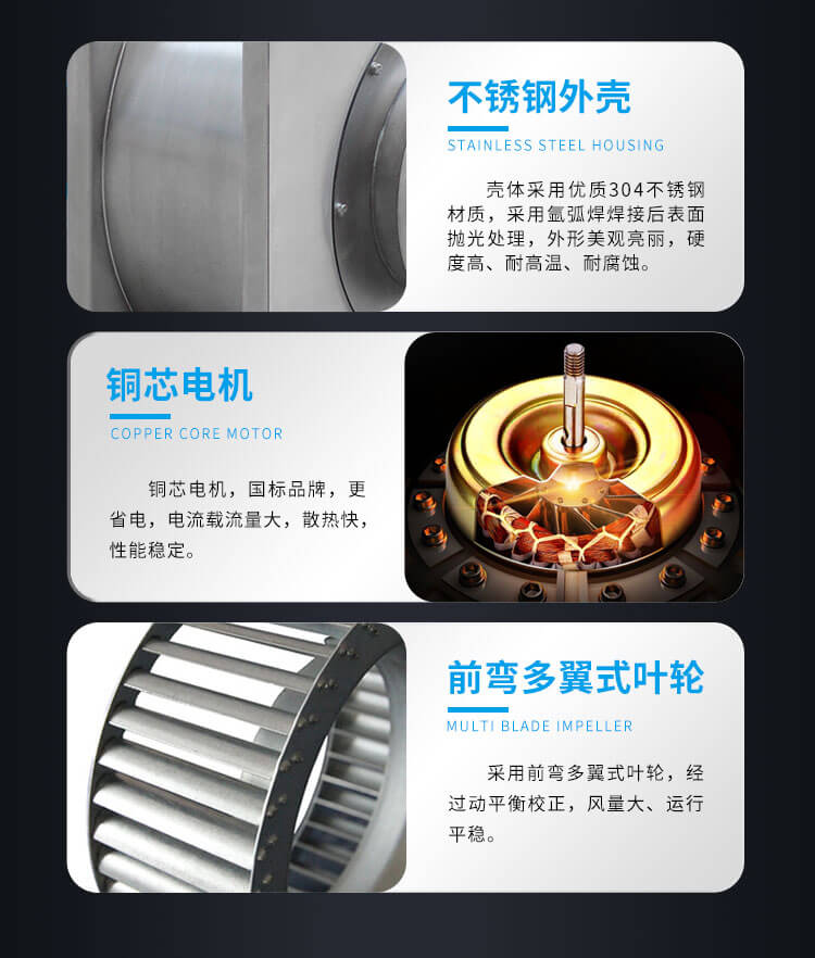 靜壓高、風量大,結構先進、合理,良好的氣動性能,適用于復雜的管網環境,是油煙的克星。