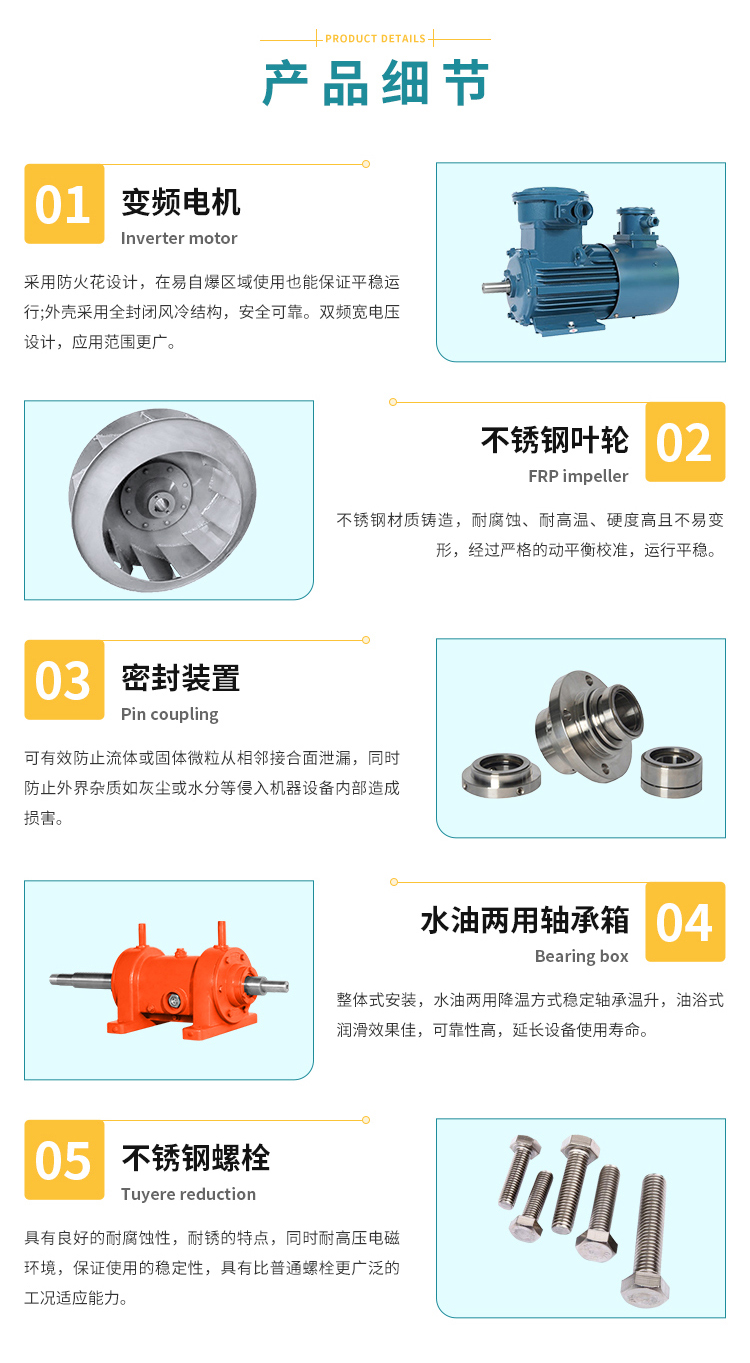 耐高溫、耐銹蝕,具有良好的氣動性,運轉平穩、振動小、效率高、使用壽命長。