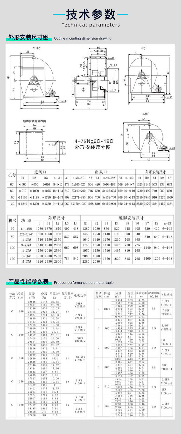 F4-72型離心通風機可作為一般工廠及大型建筑物的室內通風換氣用,輸送空氣和其他不自燃的、對人體無害的、對銅材無腐蝕性的氣體。氣體內不允許含有黏性物質,所含塵土及硬質顆粒物不大于150mg/m3。氣體溫度不得超過80°C。F4-72型離心風機采用不銹鋼、玻璃鋼、PP料等材質,用于輸送腐蝕性氣體,其性能及地基尺寸與4-72型相同。