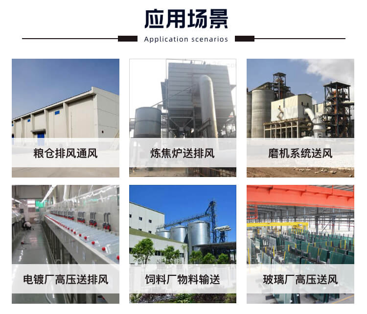 一般用于鍛冶爐、玻璃、電鍍、陶瓷、無線電等行業高壓強制通風,并可廣泛用于糧食、飼料、礦粉等加工行業的物料輸送及紙箱機械設備、鋼化玻璃設備等配套使用。輸送的介質為空氣和其它不自燃、對人體無害、無腐蝕性氣體,氣體內不允許有粘性物質,所含的塵土及硬質顆粒物不大于150mg/m3,一般通風換氣時使用溫度不得超過80℃。