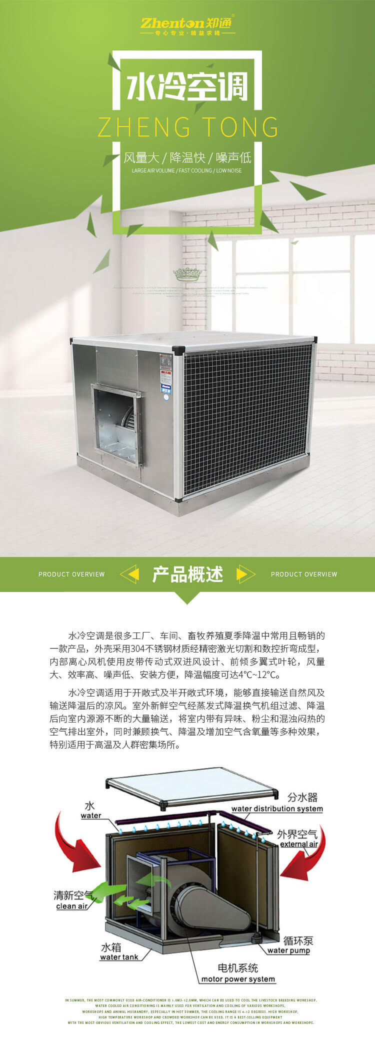 水冷空調(diào)適用于開敞式及半開敞式環(huán)境,如工廠、寫字樓、商場(chǎng)、醫(yī)院、養(yǎng)殖場(chǎng)等場(chǎng)所,能夠直接輸送自然風(fēng)及輸送降溫后的涼風(fēng)。室外新鮮空氣經(jīng)蒸發(fā)式降溫?fù)Q氣機(jī)組過(guò)濾、降溫后向室內(nèi)源源不斷的大量輸送,將室內(nèi)帶有異味、粉塵和混濁悶熱的空氣排出室外,同時(shí)兼顧換氣、降溫及增加空氣含氧量等多種效果,特別適用于高溫及人群密集場(chǎng)所。