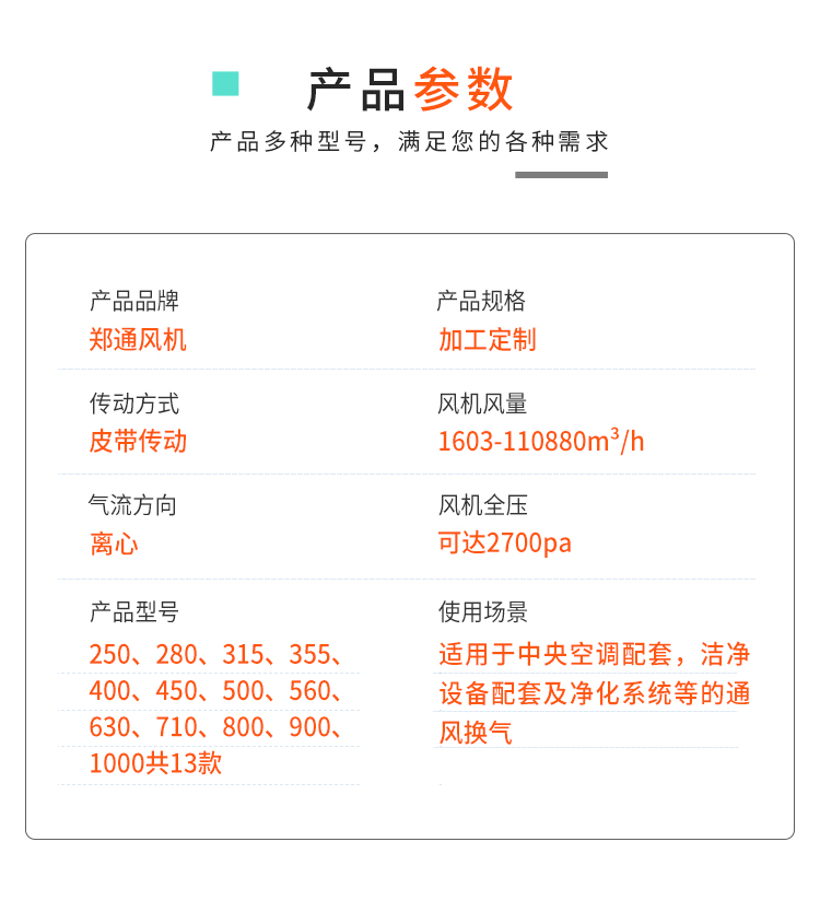 適用于工礦企業,賓館,大型商場等建筑購施的各種大小規格的空調箱,風機柜式空調機組,中央空調機組和各種凈化購備,具有通用性強,效率高,噪聲低,風量大等特點。輸送不自燃,無腐蝕性氣體,氣體含塵量和其他固體含量≤100mg/m3,溫度在-20℃-80℃。