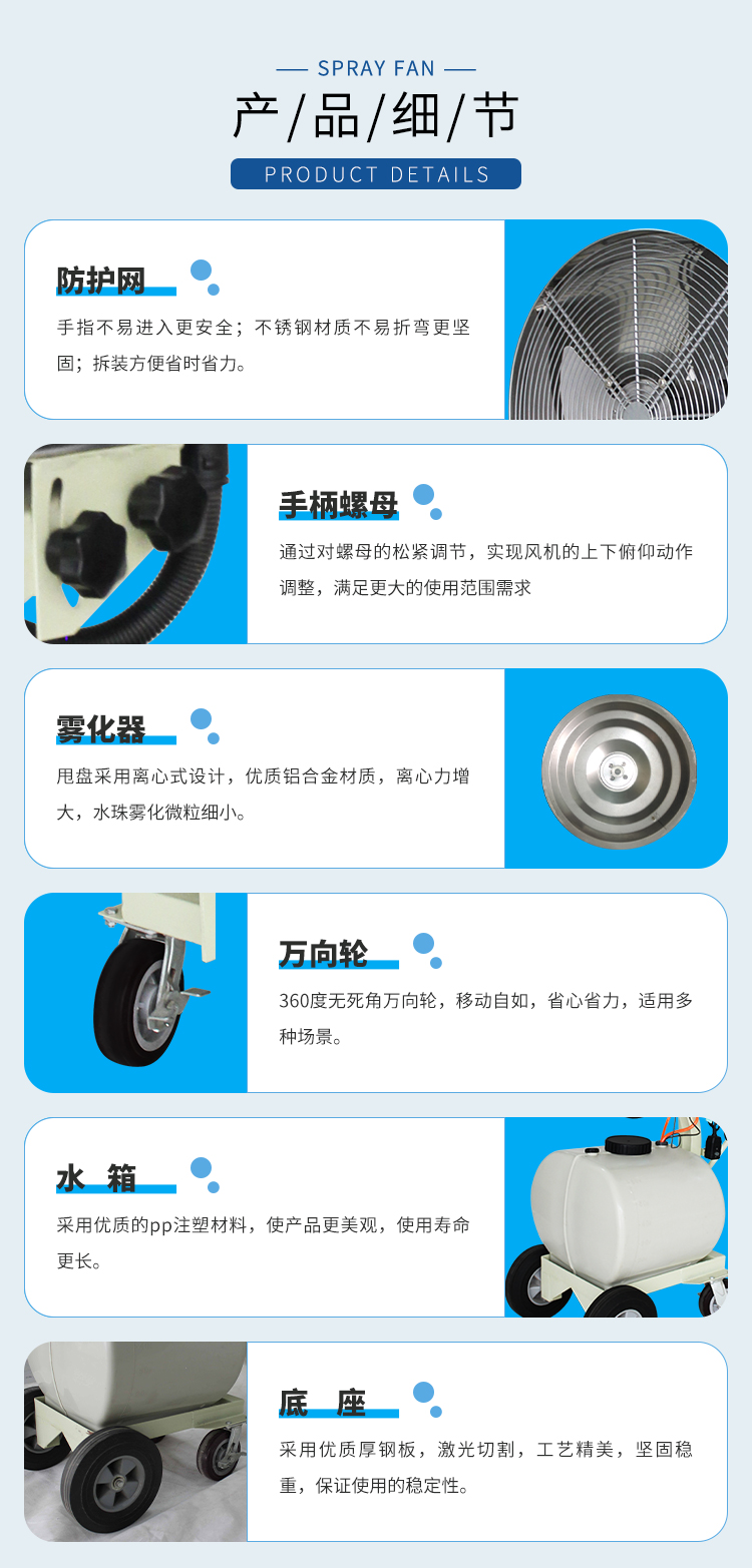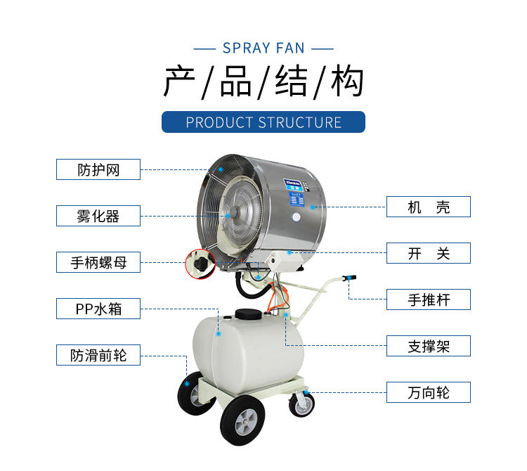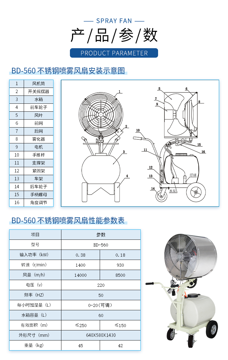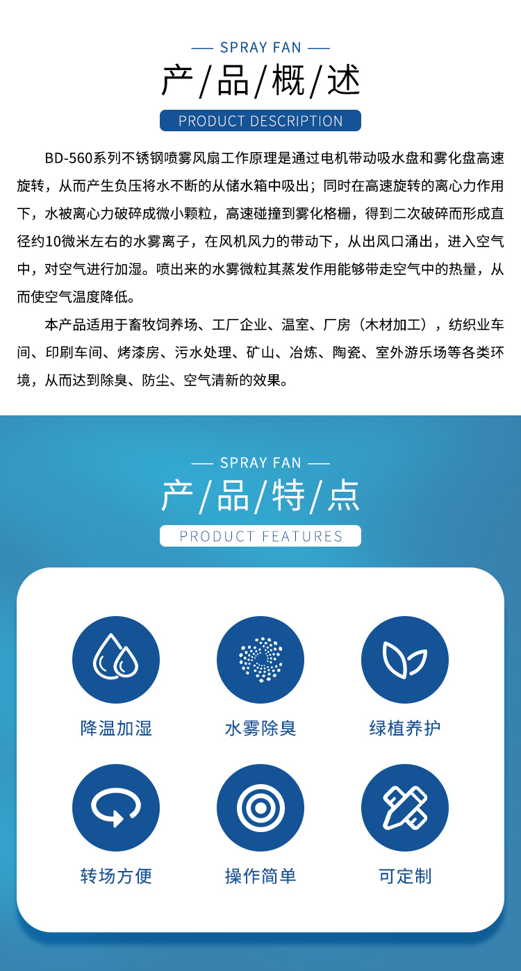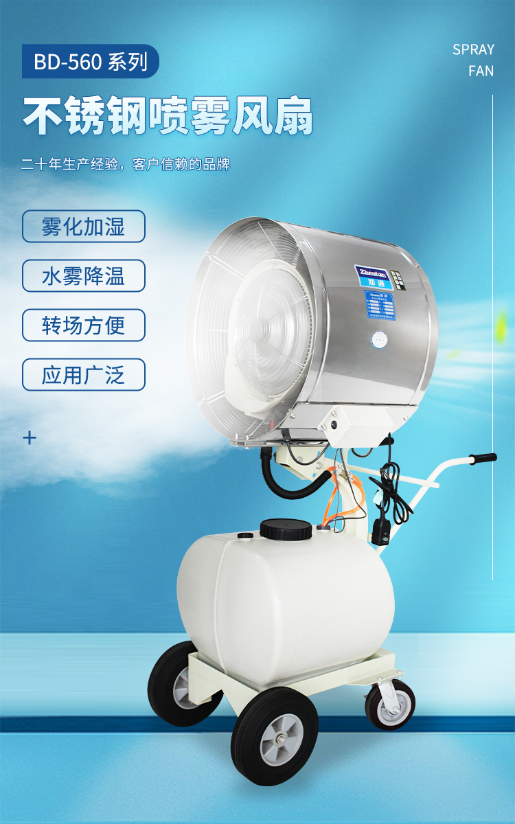 BD-560系列不銹鋼噴霧風扇工作原理是通過電機帶動吸水盤和霧化盤高速旋轉,從而產生負壓將水不斷的從儲水箱中吸出;同時在高速旋轉的離心力作用下,水被離心力破碎成微小顆粒,高速碰撞到霧化格柵,得到二次破碎而形成直徑約10微米左右的水霧離子,在風機風力的帶動下,從出風口涌出,進入空氣中,對空氣進行加濕。噴出來的水霧微粒其蒸發作用能夠帶走空氣中的熱量,從而使空氣溫度降低。