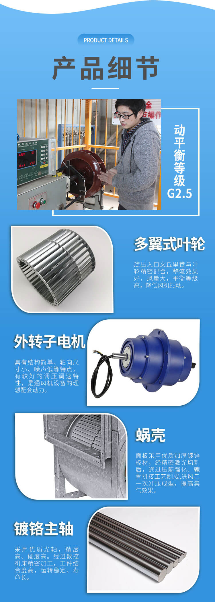 外轉(zhuǎn)子電機(jī)直聯(lián)雙進(jìn)風(fēng)通風(fēng)機(jī),前傾多翼葉輪、低噪音。