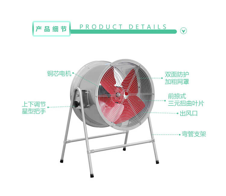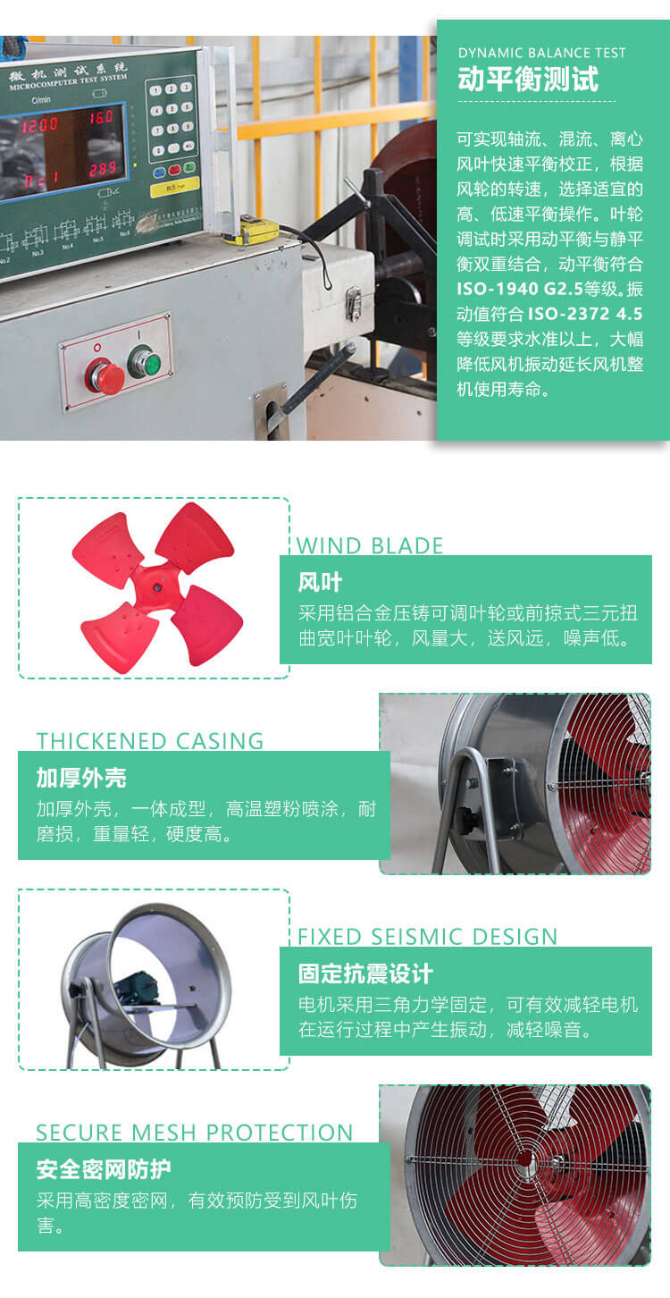 JGF低噪音崗位式軸流風機風葉可采用鋁合金壓鑄可調葉輪或前掠式三元扭曲寬葉葉輪,風量大、送風遠、噪聲低